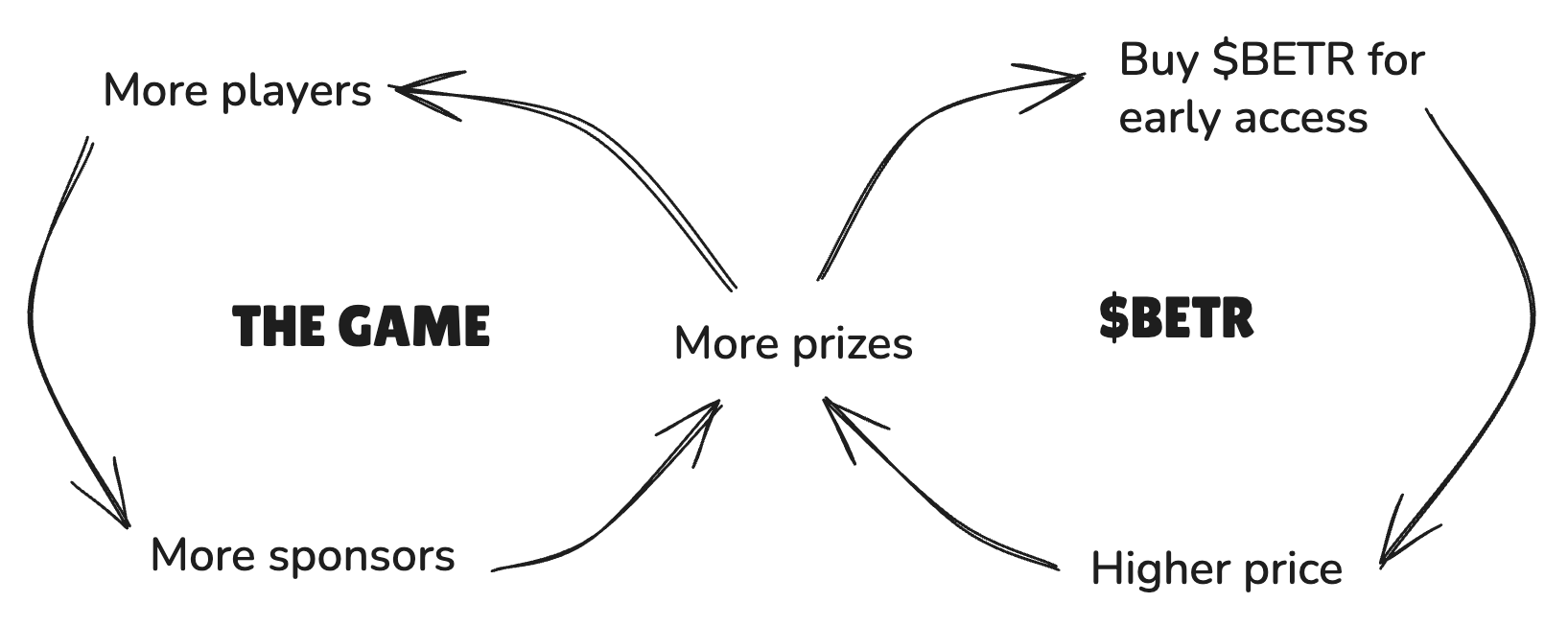 "More prizes" is where the flywheels interlock. The juicier the prizes, the more demand to join the BETR Believers group. Which leads to the price of $BETR rising, which provides funds to continue running the game — or potentially, to increase the prize pools.