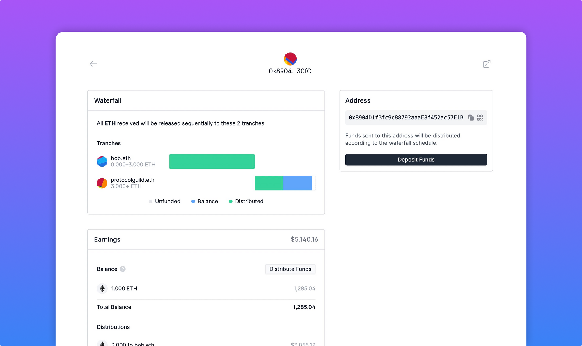 We built Waterfall after seeing people change their Splits after a specific amount of funds had been received. For example, the NFT mint would conclude, $50k would be distributed through the Split, and then the Split would be modified to account for future income. Waterfall securely handles all this for you, without you needing to manage it yourself. Set it up once and the contract handles the rest.