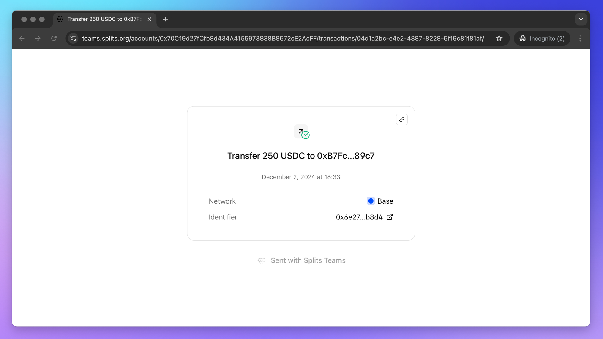 When paying or sending funds to someone outside of your team, it's helpful to share a receipt with them as proof of payment. So now you can share a transaction link with someone and they will see a public view of that transaction.