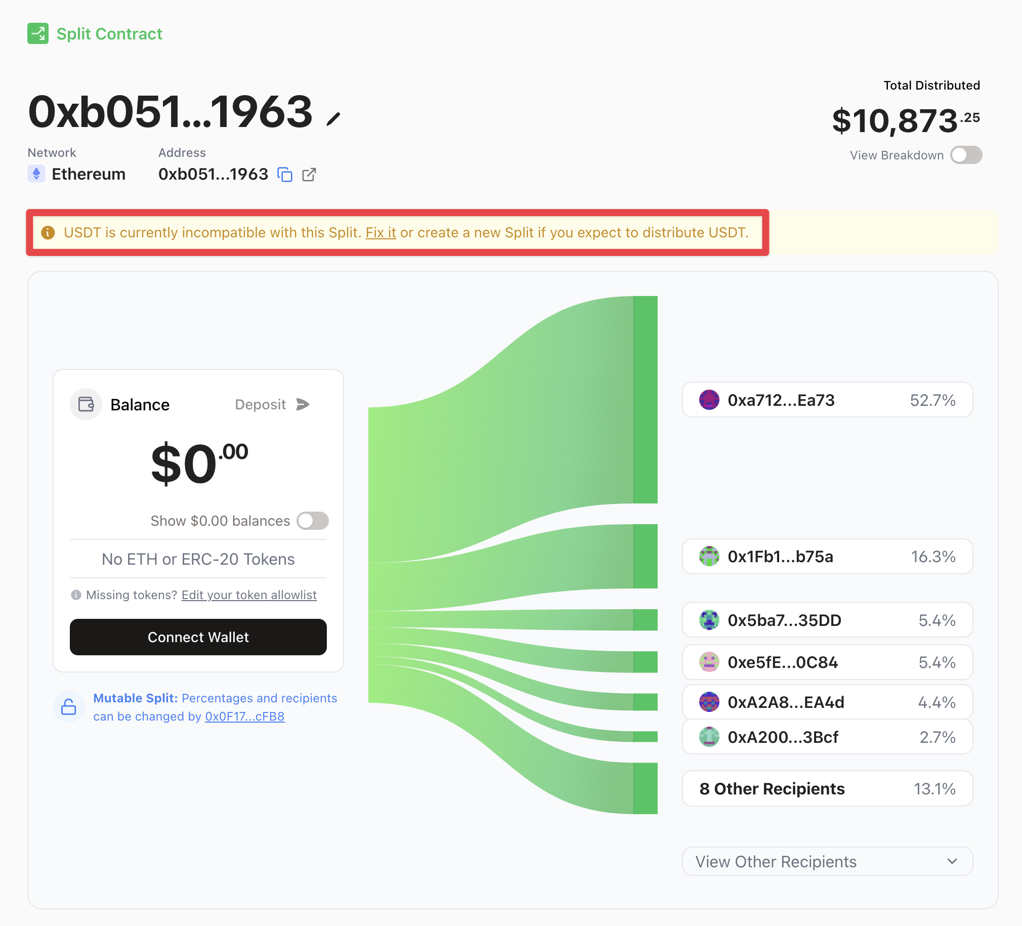 If you are using an immutable V2 Split on Mainnet and it might receive USDT in the future, please create a new Split via our UI or the latest SDK. If you’re not sure if your Split is V2 and immutable, open your Split in our app. If your Split is affected, you will see a message at the top of the page.