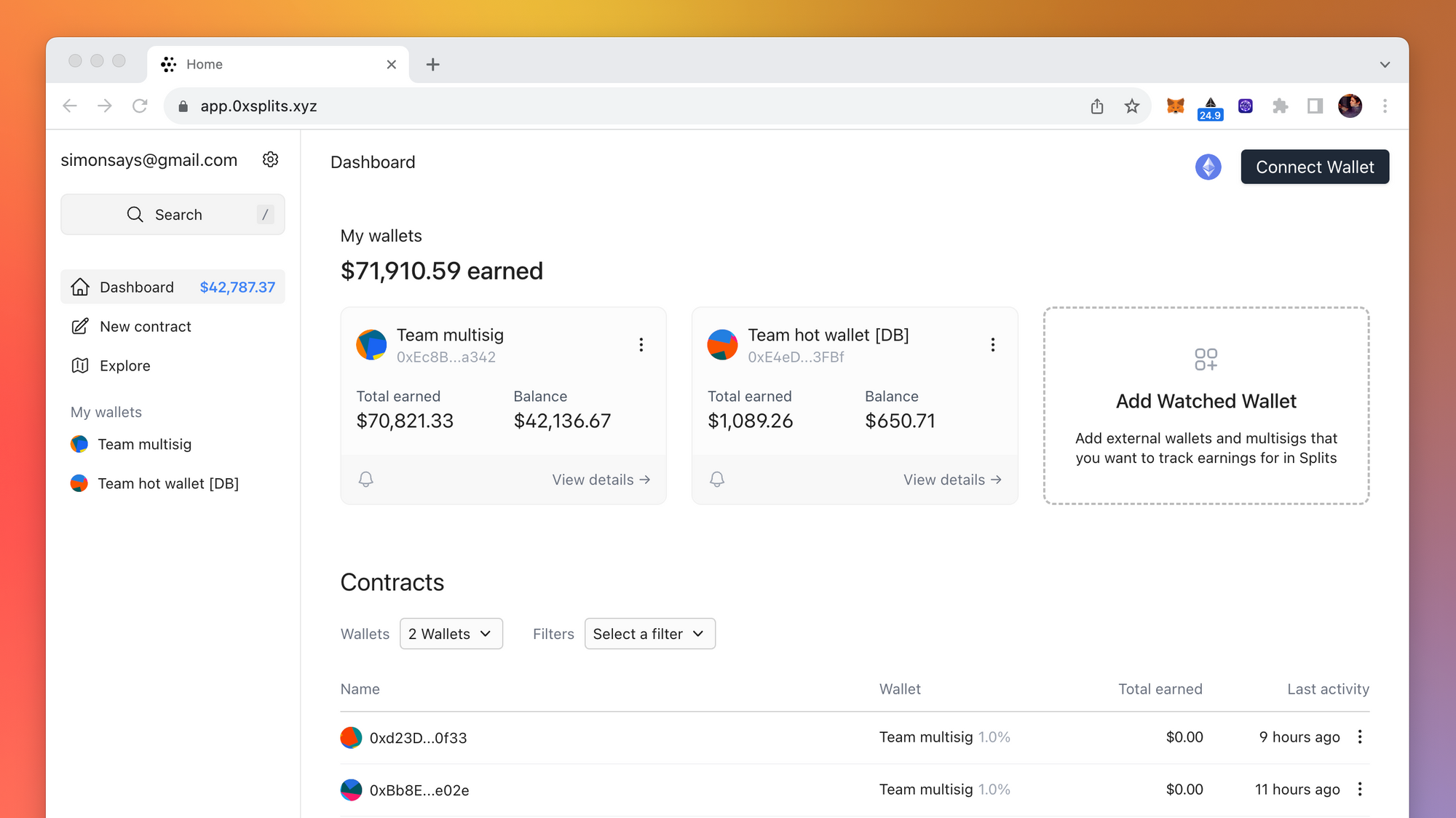 We released the multi-wallet dashboard view a few weeks ago and have been iterating on it since then. We'll be improving this design in the coming weeks, but in the meantime a quick reminder that all Splits/contracts displayed in the below table are a function of what watched wallets and filters you've applied.