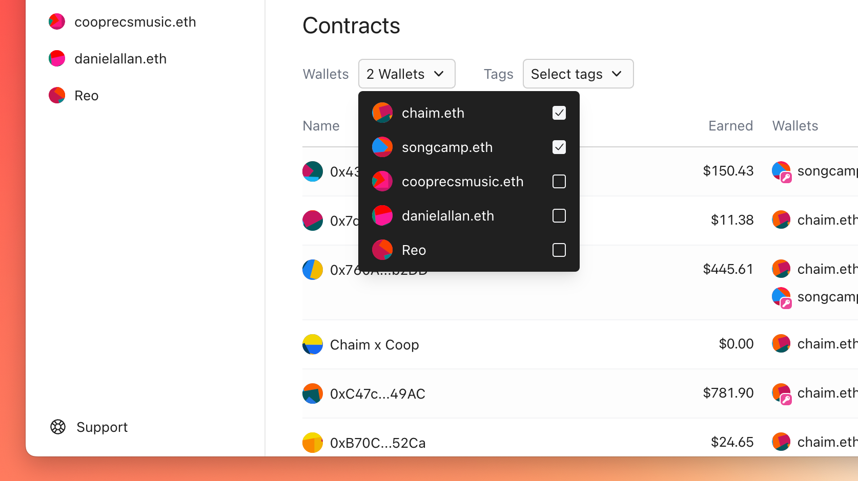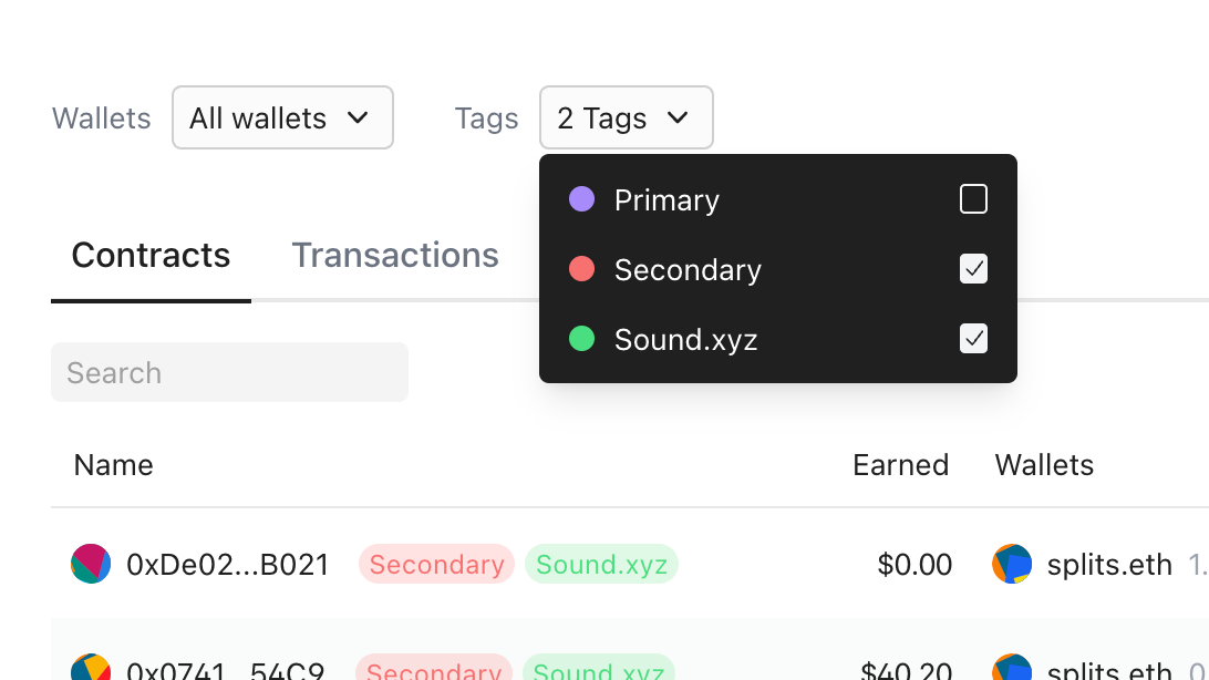 Select which wallets and/or tags you want to see the contracts for