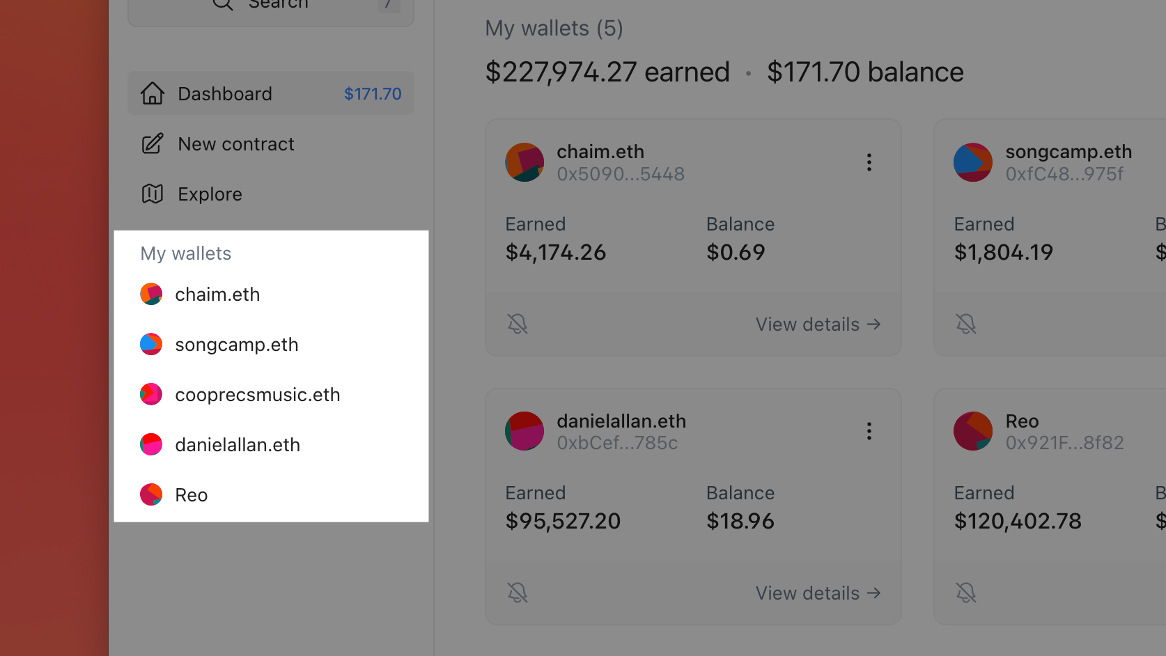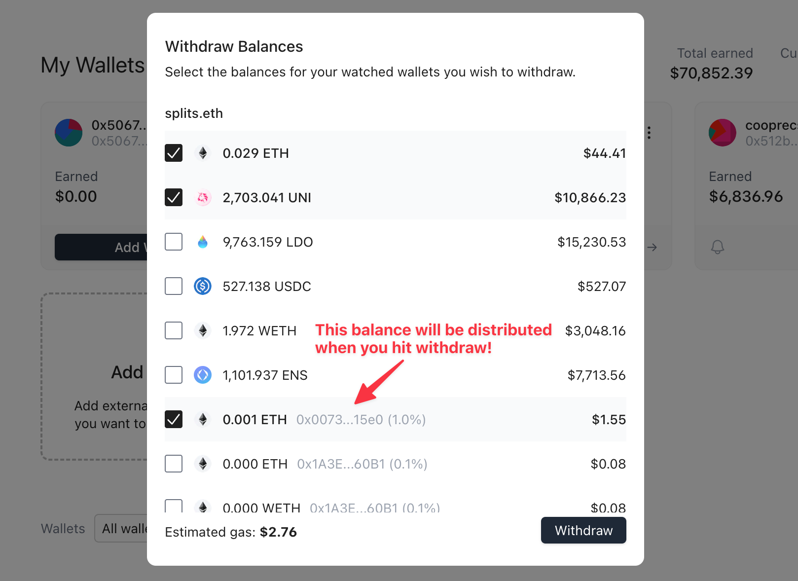 You can easily see how much you've earned across all your watched wallets. We'll be adding more functionality to this soon, like showing your total balances and adding the ability to withdraw balances for all your wallets in a single transaction.