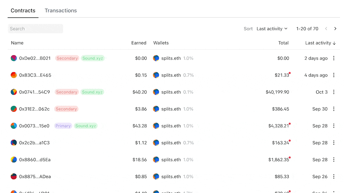 We’re now displaying all contracts in a more consistent manner, making it easier to see any account’s earnings, balance, and last activity. Additionally, when viewing a Split on an account page, you can see the percentage of the Split that account is earning.