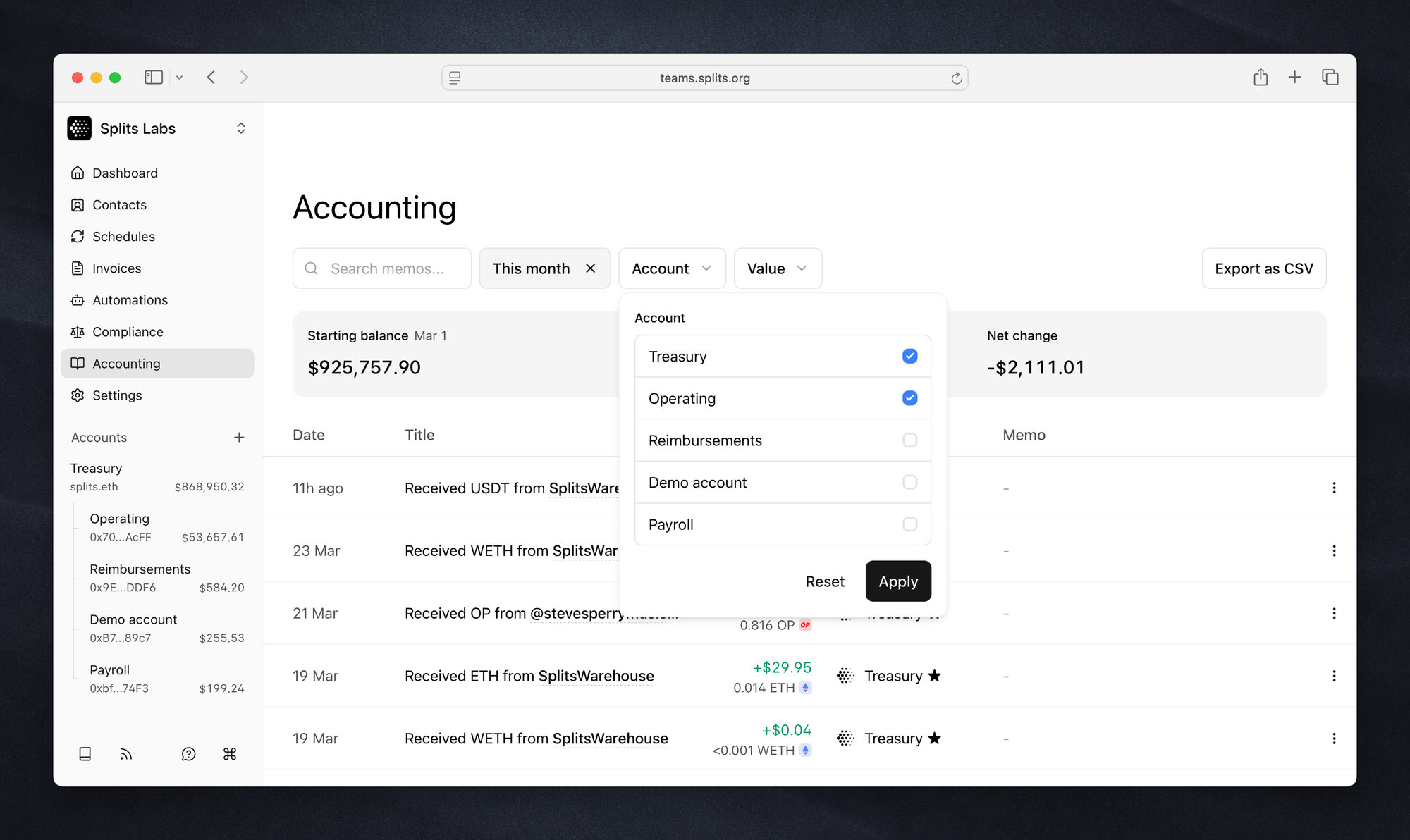 We also updated the filters so you can generate custom statements for specific accounts. For example, you can now see how your Treasury account balance changed over a specific time period.