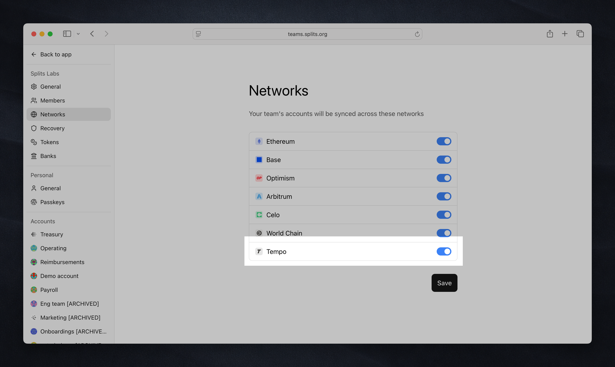 You can also now use Teams on Arbitrum. To enable Arbitrum (or change any networks on which your accounts are synced), go to your team's account settings page and toggle on/off specific networks.