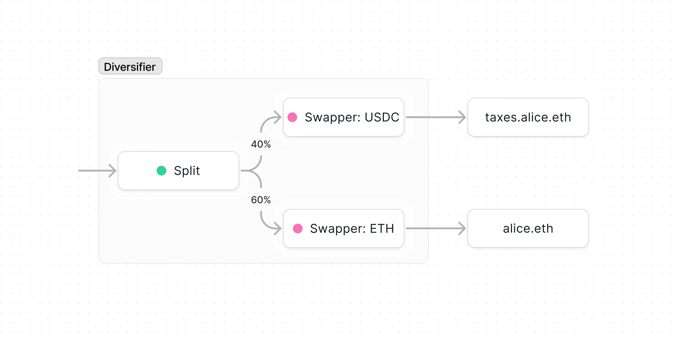 In the example above, incoming payments are split into two streams — 40% is swapped into USDC and withdrawn to taxes.alice.eth, while the remaining 60% is swapped into ETH and withdrawn to alice.eth.