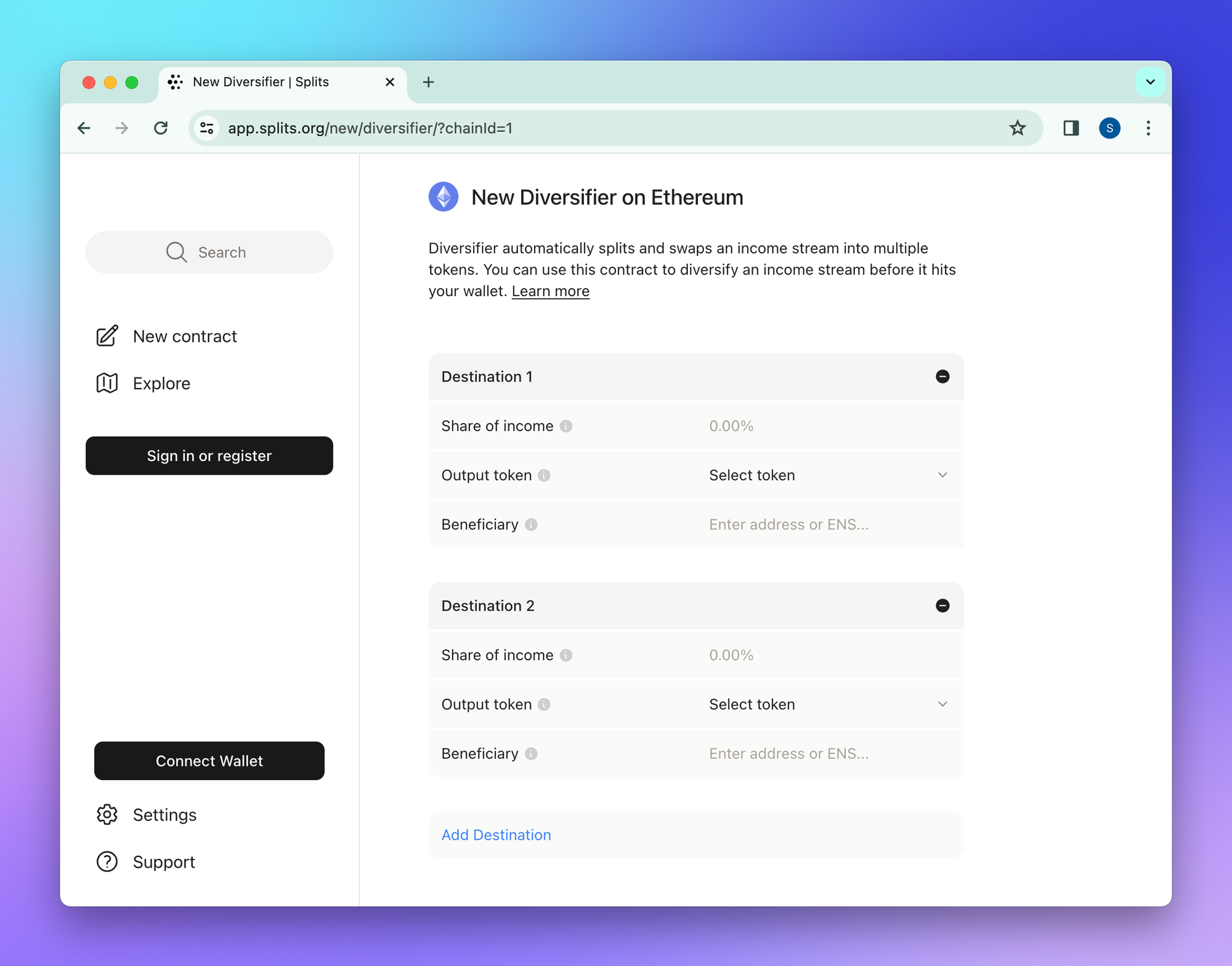 Editing the Diversifier lets you change the share of income, the output token, and the beneficiary. You can also add a new destination. If you want the new destination to receive a particular output token, you’ll need to create a new Swapper contract and use its address as the beneficiary.
