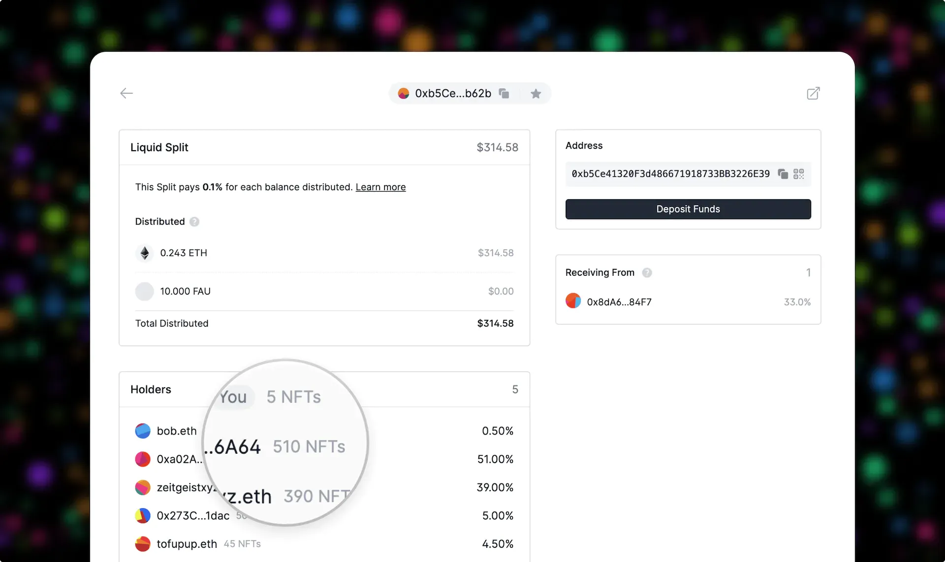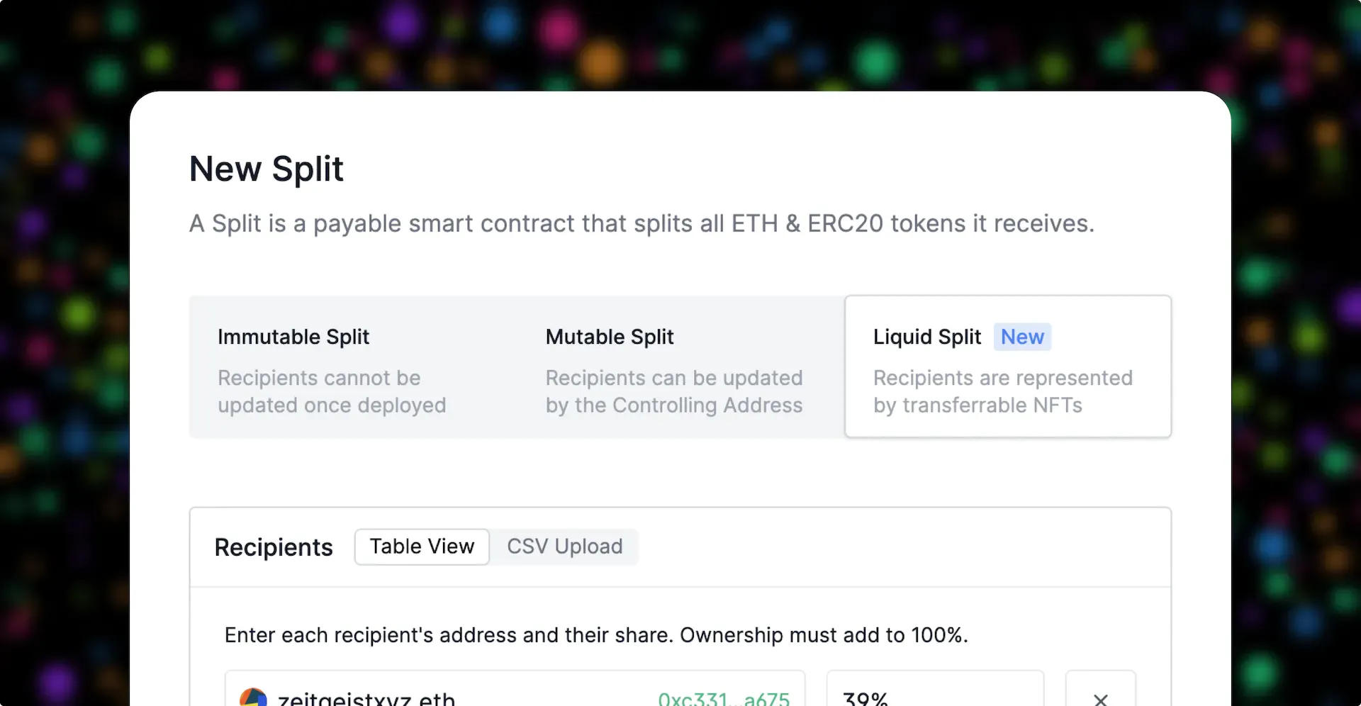 Today we're adding a new type of Split to the app, Liquid Splits. Unlike standard Splits where ownership is controlled, Liquid Splits use NFTs to represent ownership. This gives control of the Split to recipients themselves by allowing shares to be easily transferred, either wholly or partially, to anyone else.