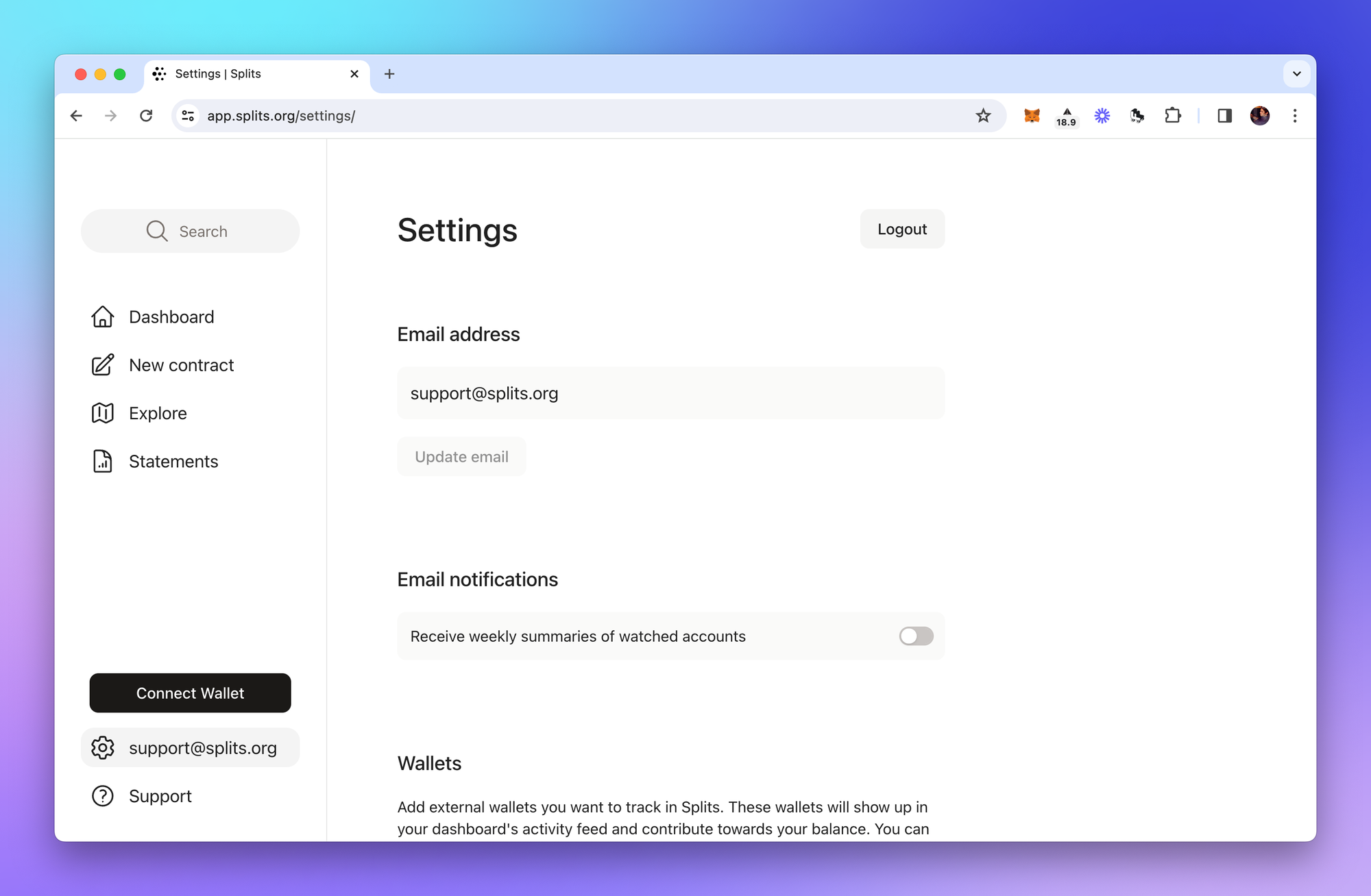 Use the toggle to choose whether you wish to receive a weekly digest email summarizing your watched wallets. These summaries include all activity in the Splits ecosystem for your wallets, and are sent once a week.