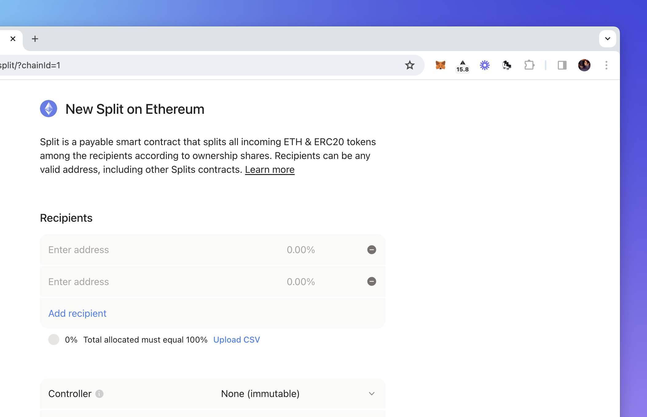 This is the account that’s able to modify the Split after it’s been created. You can think of the controller as being the “Split admin”, since they have unilateral ability to change the Split whenever they wish. Because of this, keep in mind that a Split is only as trustworthy as the admin.