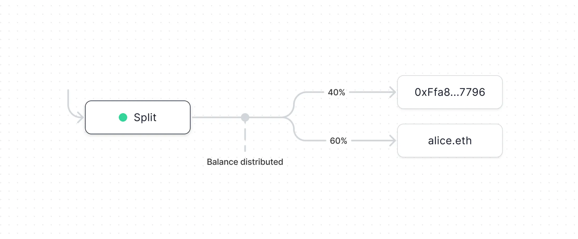 In the example above, all incoming funds are split 40% to 0xFfA8 and 60% to alice.eth.