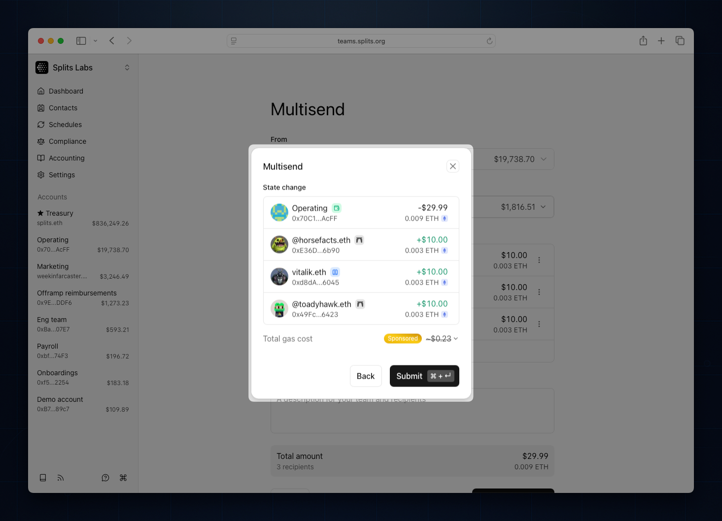 To make operating onchain faster and simpler, we’ve released a command menu and hotkeys. Now you can do anything in the app in a few keystrokes. Hit Cmd+K in your Team to get started!