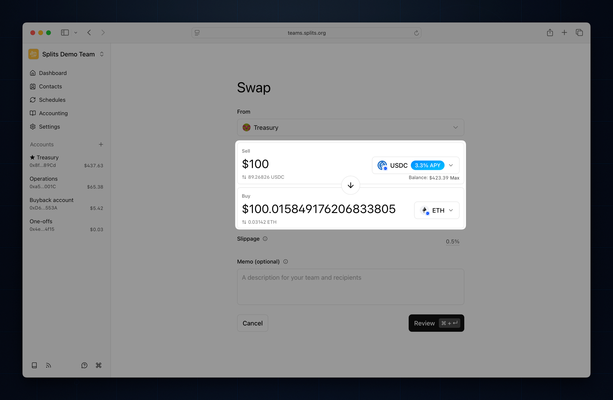 Scheduled transactions now support built-in tax compliance, enabling onchain payroll for US recipients. Create payment schedules, choose a frequency, and review or adjust payments before they’re sent.