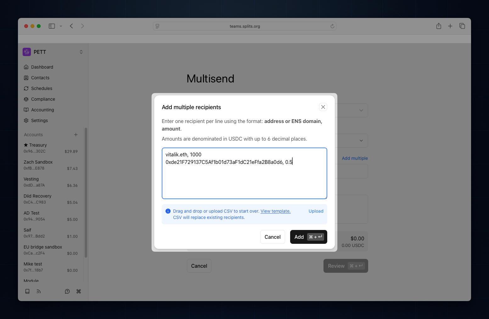 Multisend now supports CSV uploads for adding multiple recipients at once using a standard address/ENS and amount format.