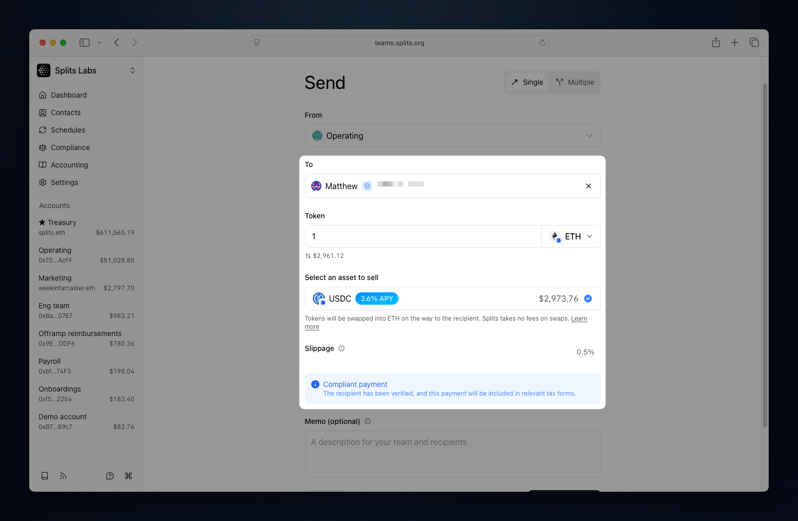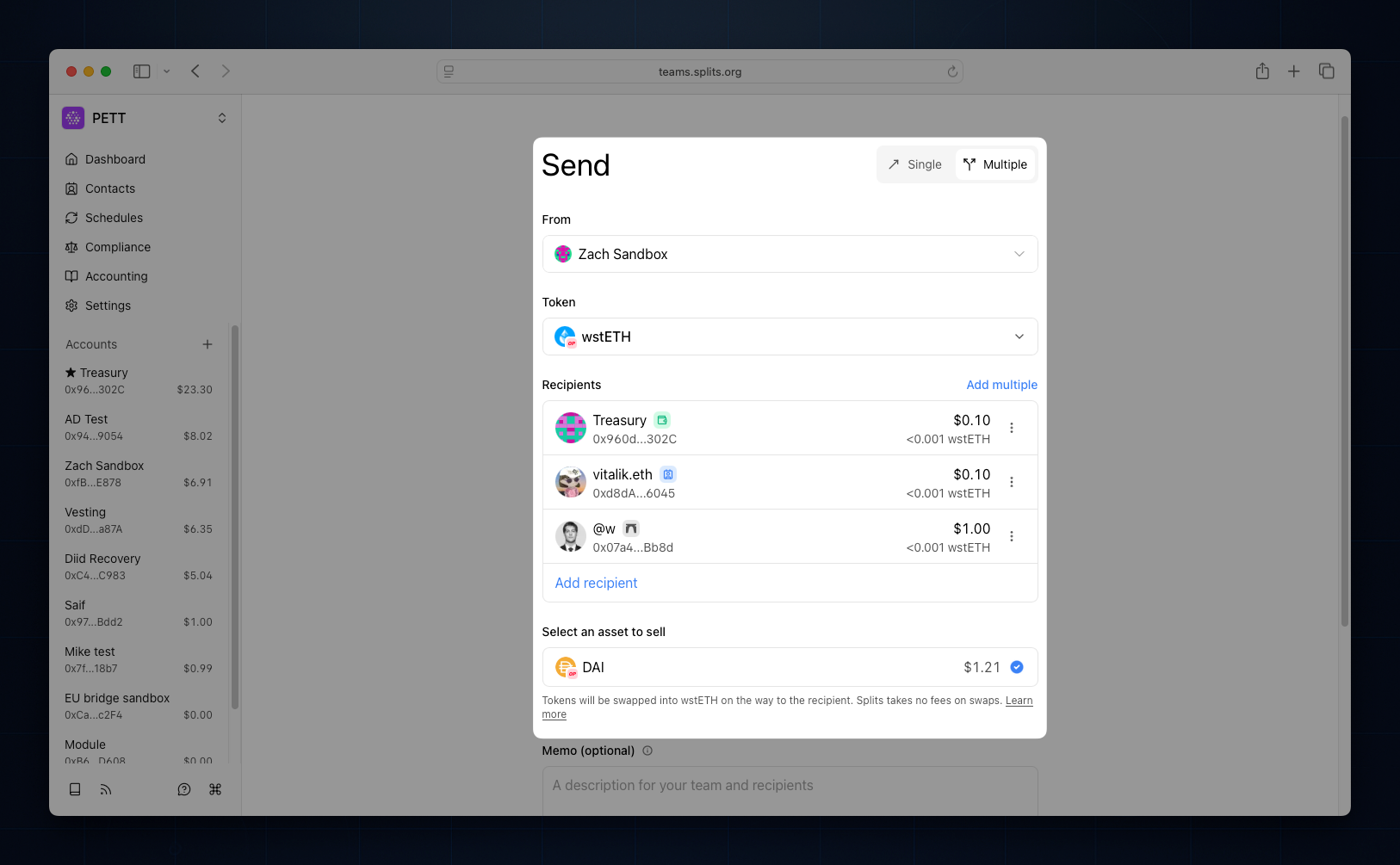 Press M in Teams to open Multisend and send to up to 100 recipients. Keep funds earning yield in stables and still pay in any token now that Multisend swaps as it sends.