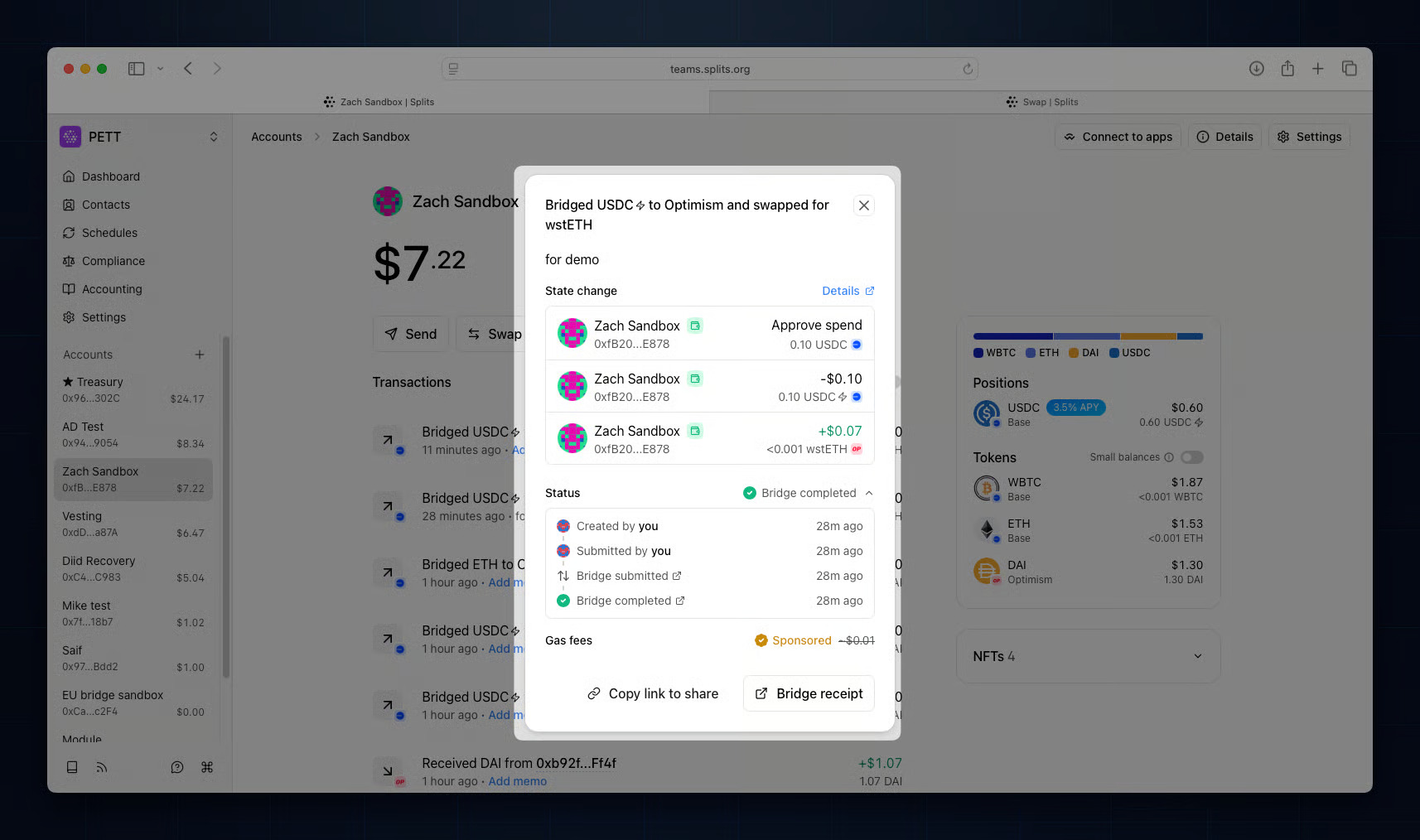 Transaction summaries for bridging and cross-chain swaps now include a timeline view to monitor progress at a glance, direct links to source and destination explorers, and the bridge receipt for tracking the transfer end-to-end.
