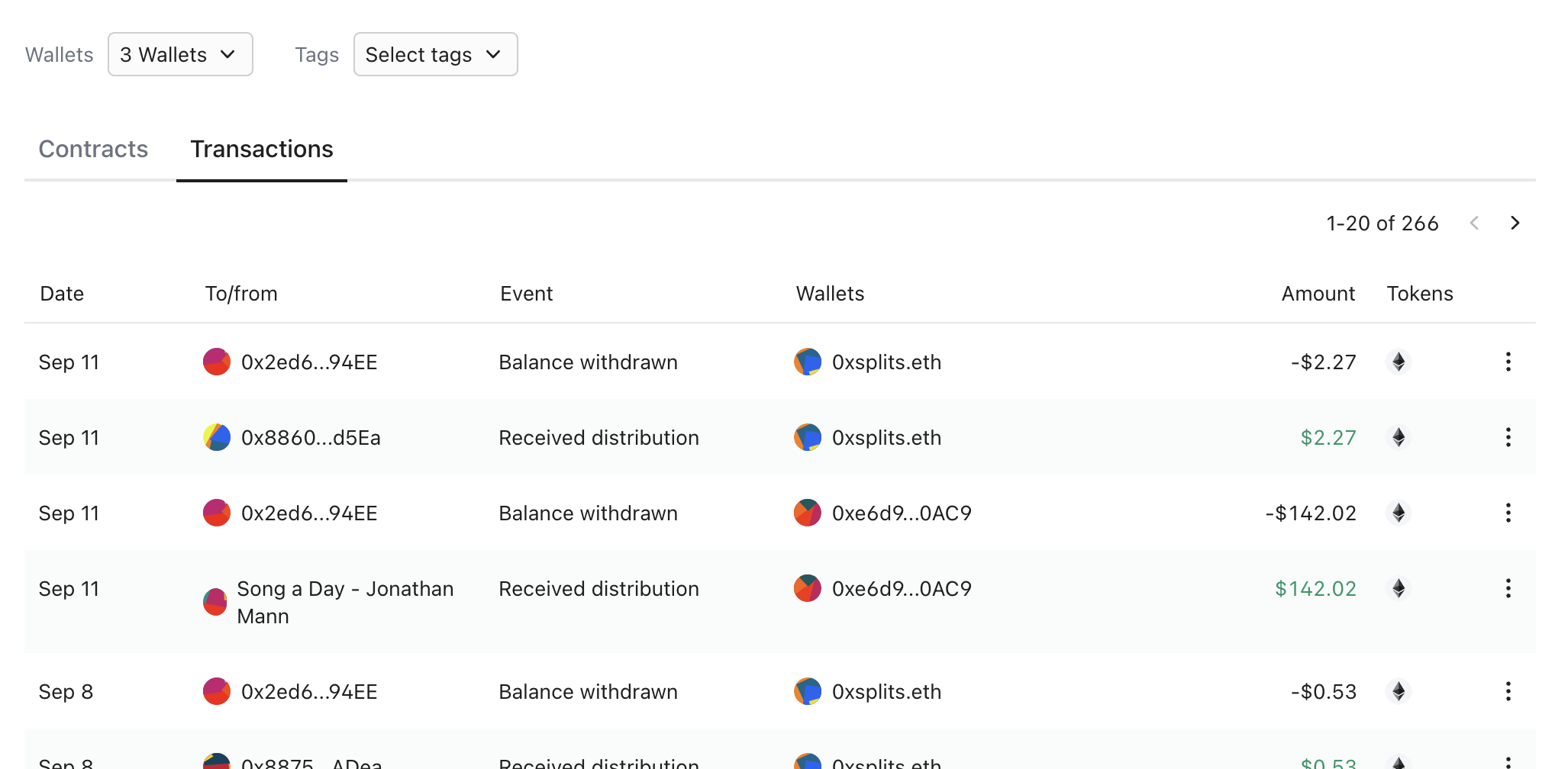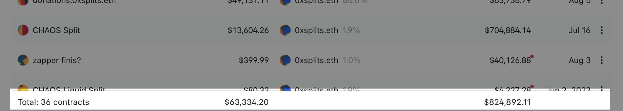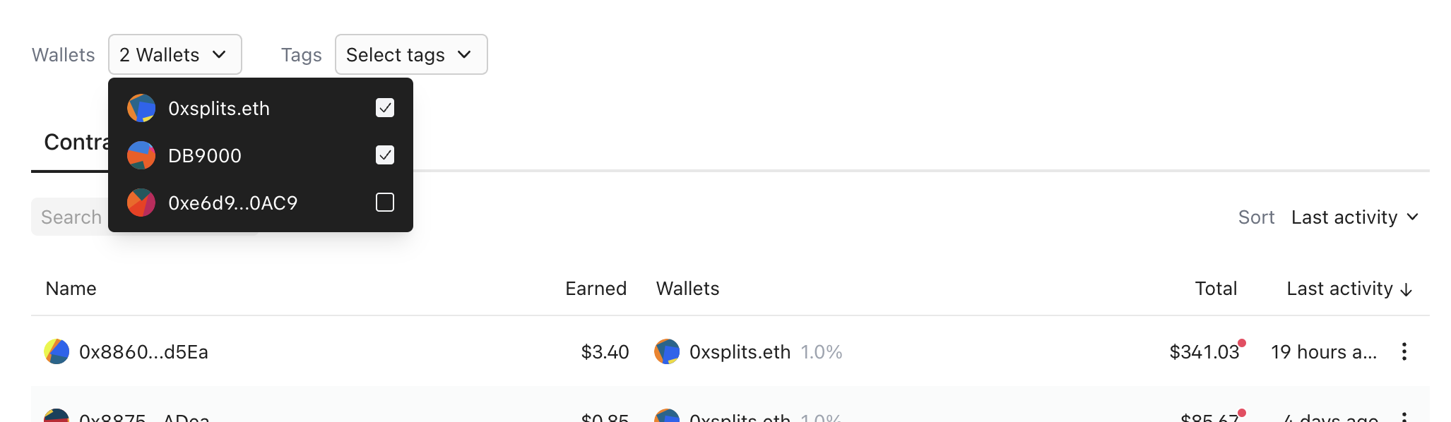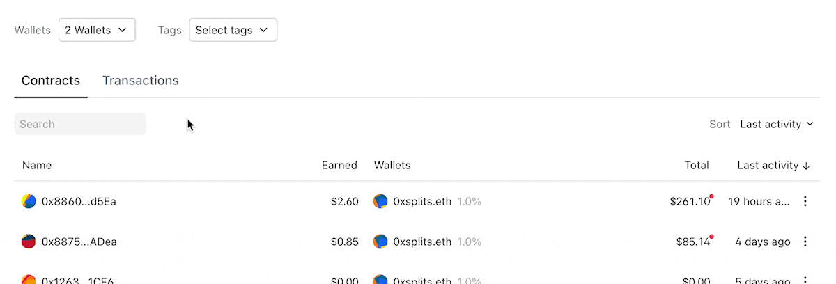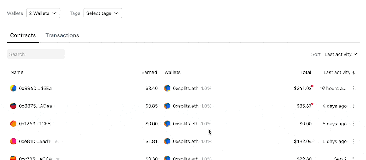 We released the multi-wallet dashboard view a few weeks ago and have been iterating on it since then. We'll be improving this design in the coming weeks, but in the meantime a quick reminder that all Splits/contracts displayed in the below table are a function of what watched wallets and filters you've applied.
