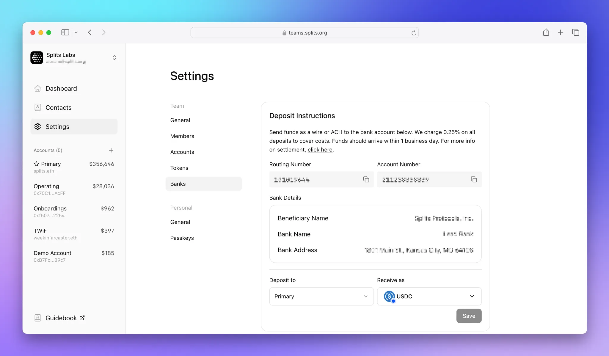 To get started, head to Settings > Banks in Teams and complete a KYC or KYB check, depending on your entity type. Once approved by Bridge, you’ll see onramp instructions and the ability to link as many banks as you’d like. To offramp, all you have to do is select a bank account in a transaction, just like you would any of your other accounts. Funds typically in less than a day, and we take no fees beyond Bridge’s 0.25%.