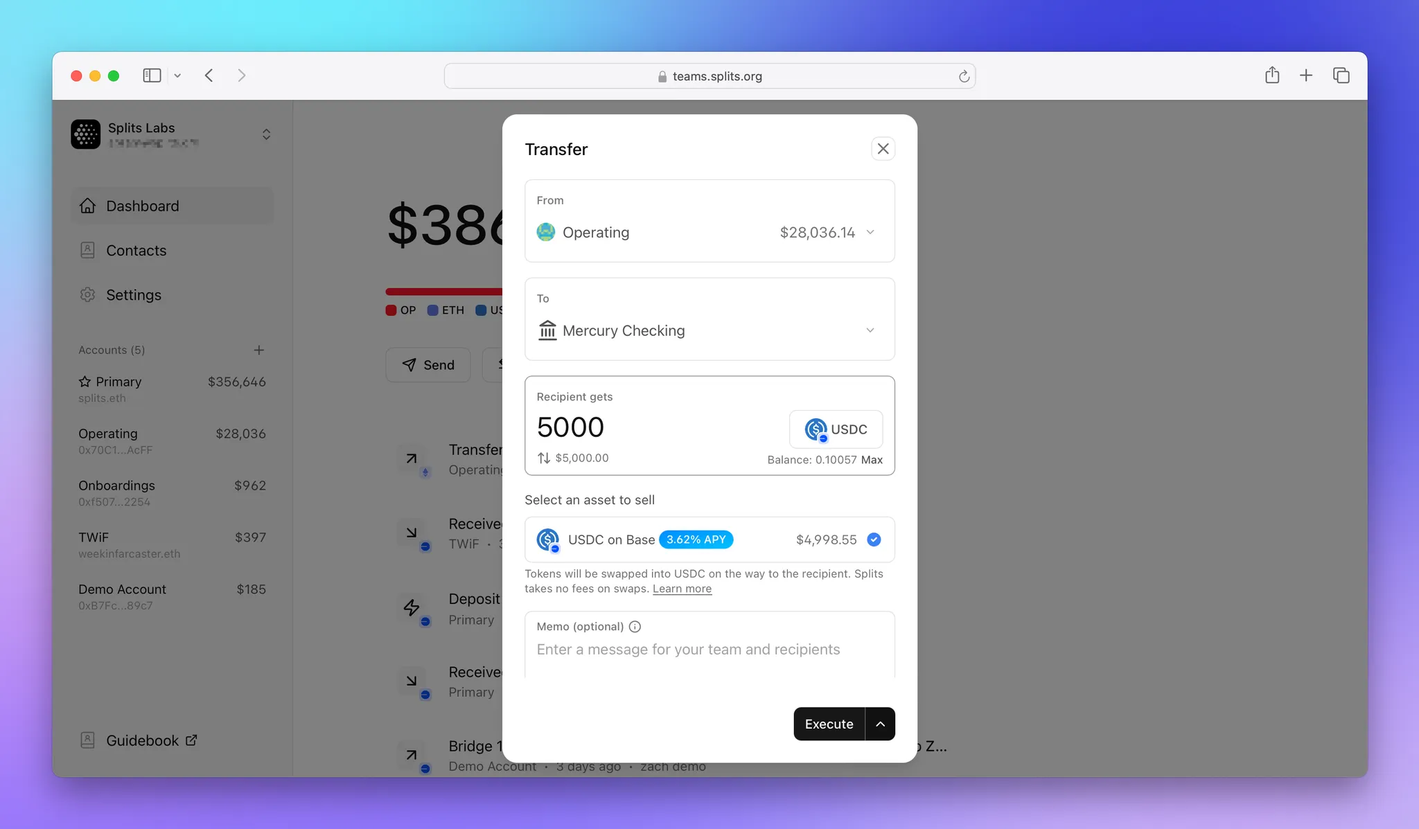 We recently shipped the ability to on and offramp funds natively within Teams. Onramping is as easy as sending a wire, and offramping is as easy as signing a transaction. You can connect any US or EU bank account, and you can offramp any token you own in just a few clicks—even interest-earning USDC positions.