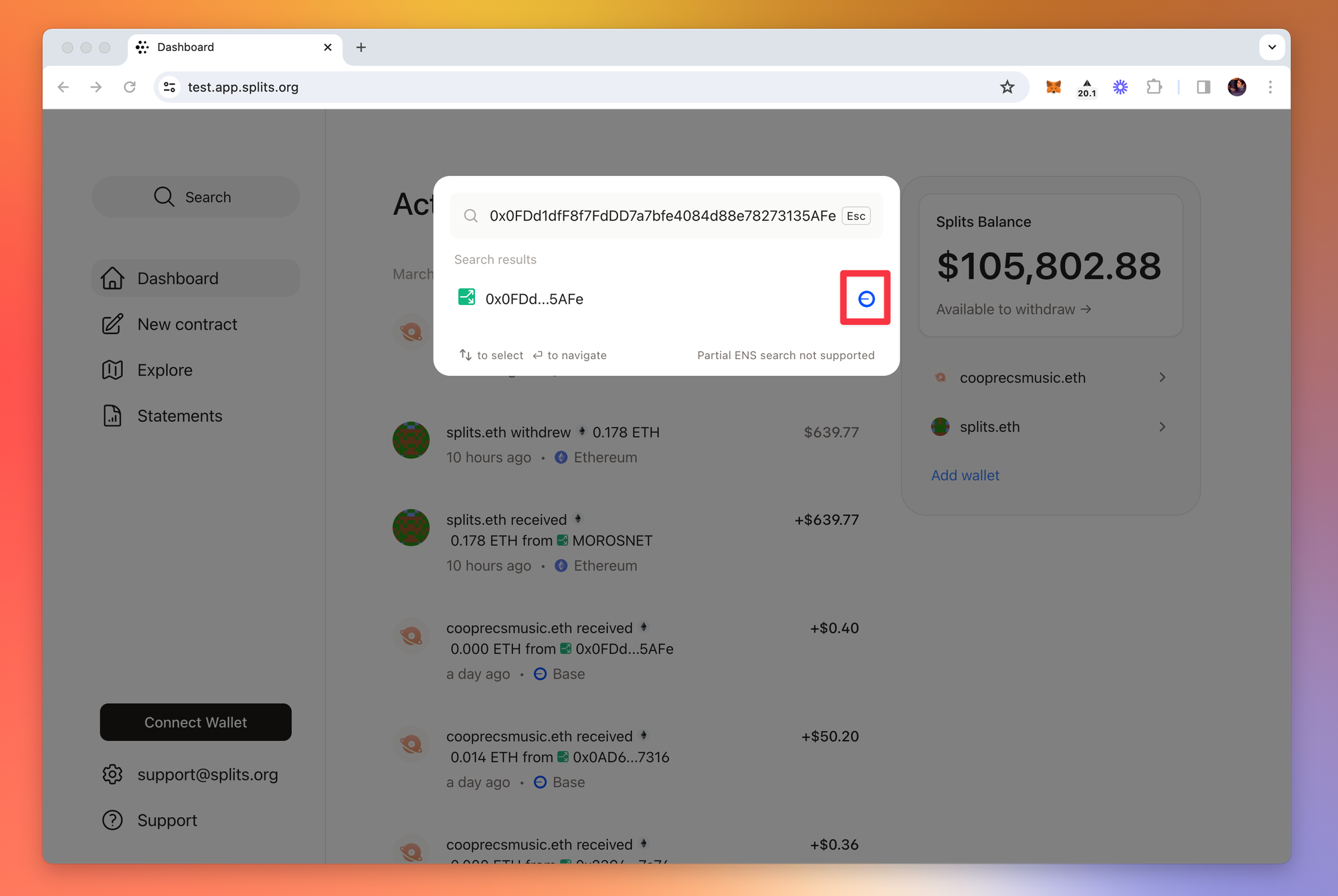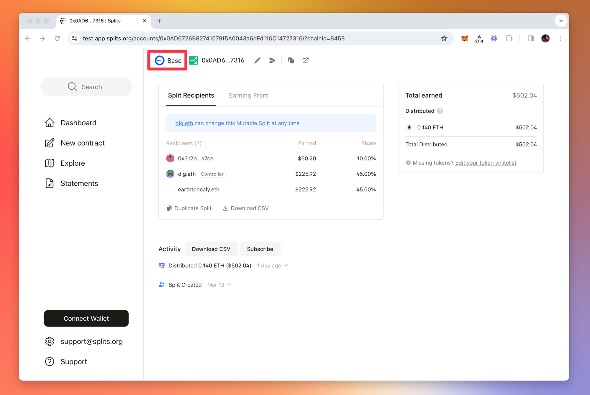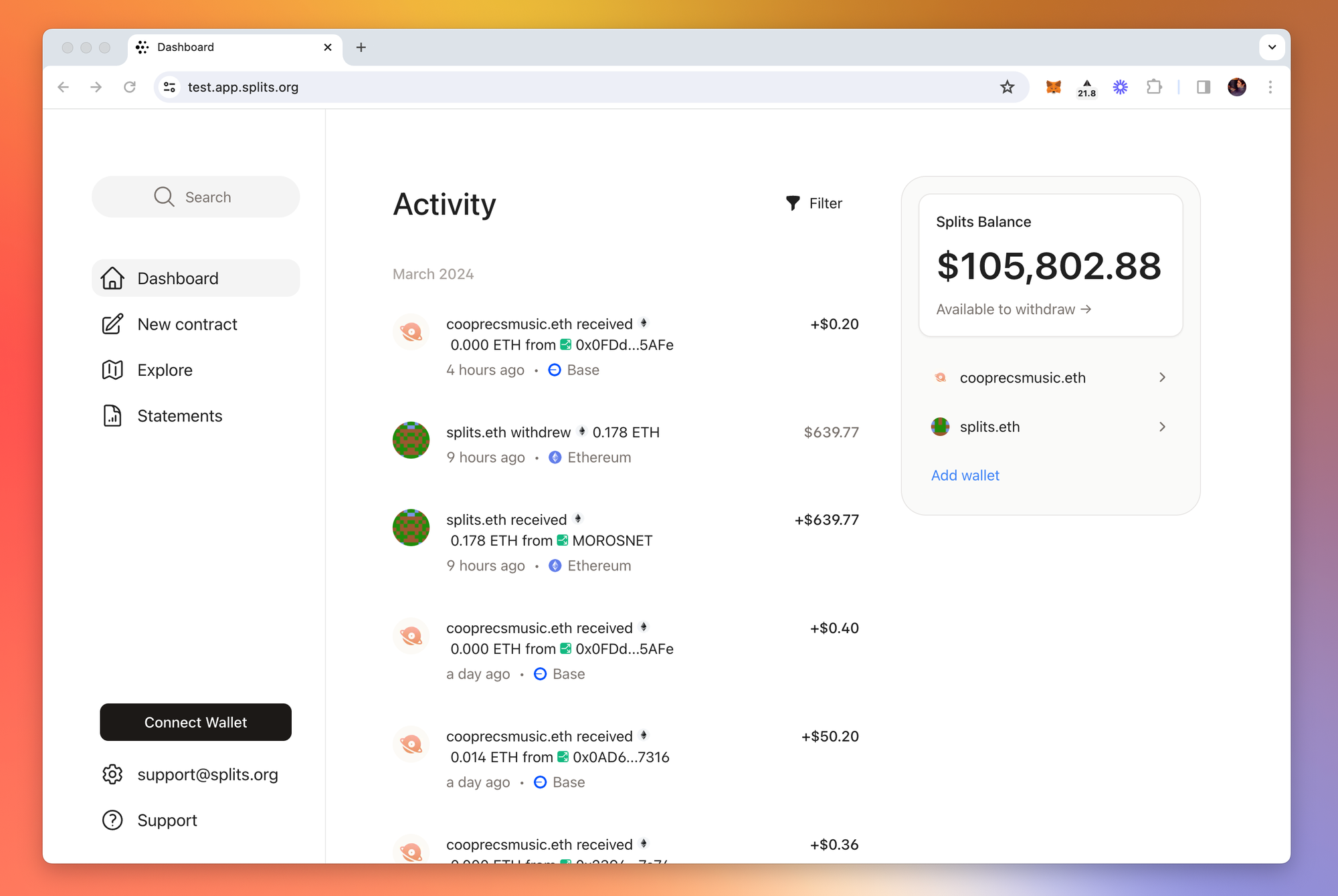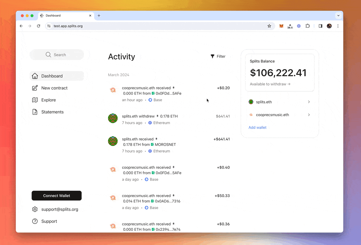 Today we’re releasing a completely rebuilt app that allows you to access all your Splits, earnings, and activity across all chains in one single view. No need to manually switch between chains or remember which one you’re looking at — the app takes care of that for you. The only time the chain you’re connected to matters is when you’re actually submitting a transaction.