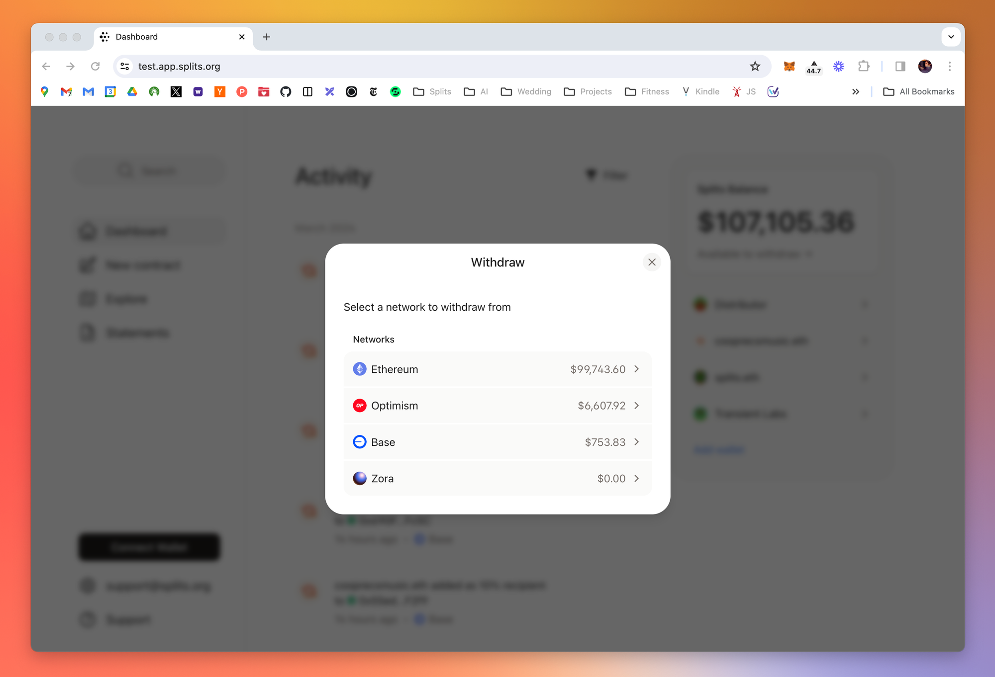 To solve this problem, we doubled down on the multichain modality. Now the Splits app makes it easy to see all your activity in a single view. Instead of selecting a specific chain, then manually switching to another, simply view all the chains in a single dashboard.