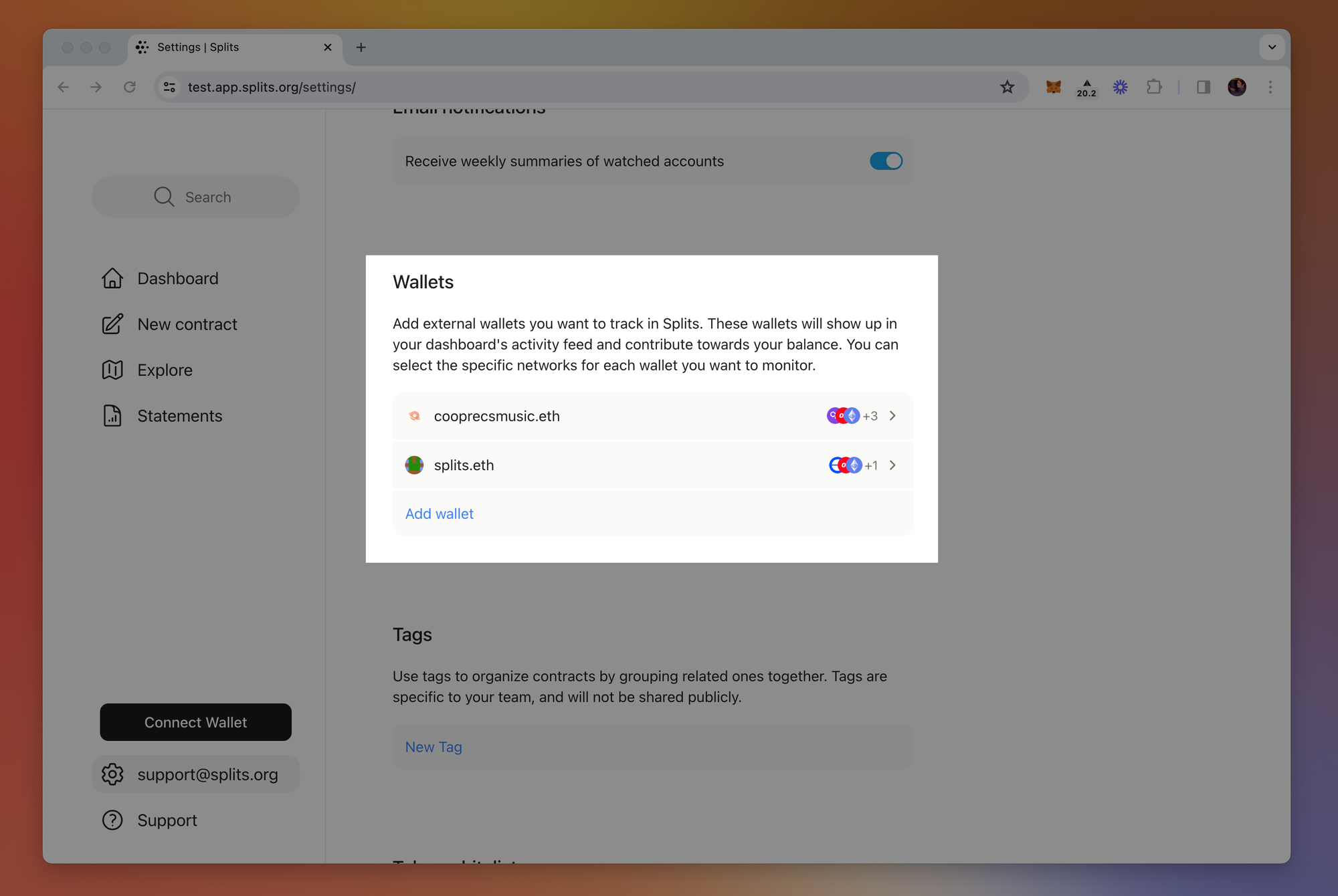 Selected networks: Select which chains to include in your dashboard for each wallet. This is helpful if you’re watching a contract (e.g., multisig) that only exists on a few chains. By default, we’ll automatically include all chains for any watched wallet you add.