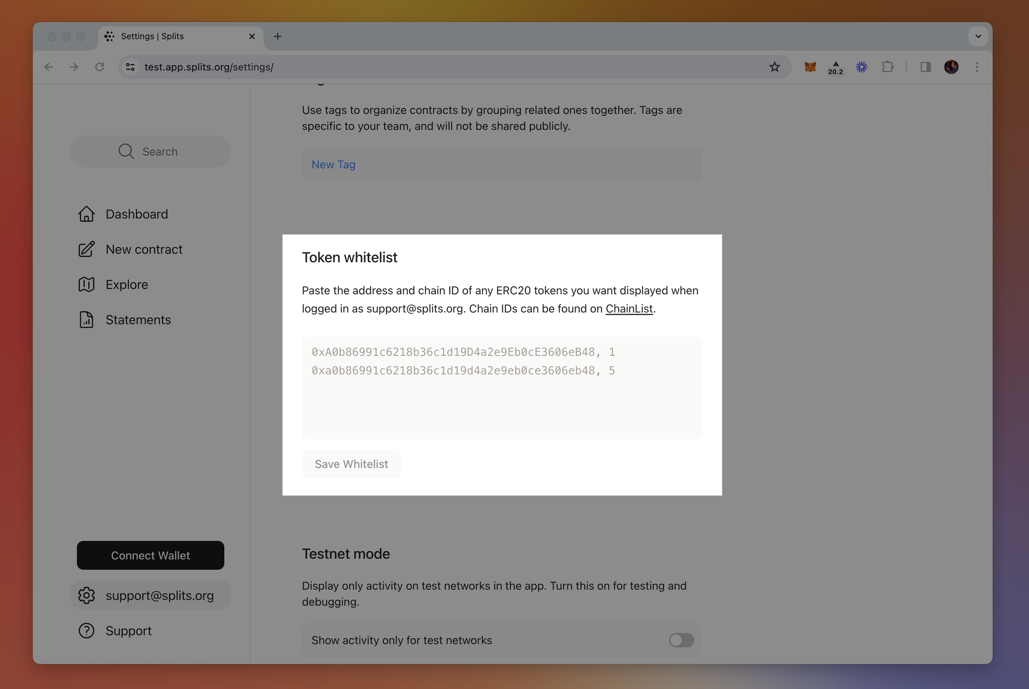 Token whitelist: Set your token whitelist on a per chain basis. Just enter in the ERC20 contract address followed by the chain ID to have that token show up in your dashboard.