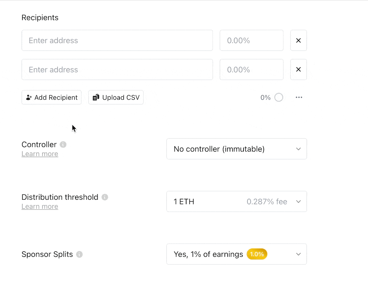Previously, choosing to make a Split mutable was separate from choosing the controller. Since a Split can only be mutable if a controller is set, we decided to combine these two steps into one by allowing you to make a selection. If you want the Split to be immutable, just select "no controller". Otherwise, you can either select yourself (if your wallet is connected) or you an enter in any address you wish.