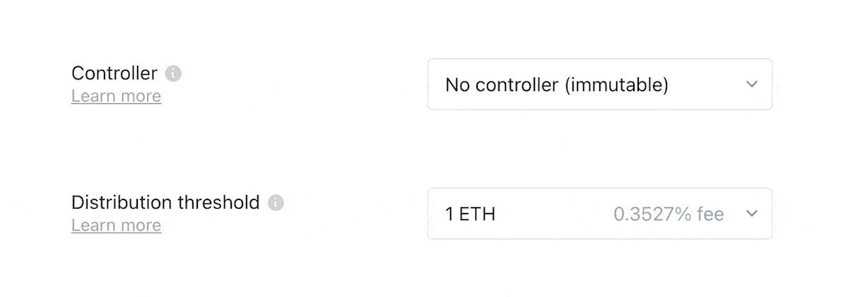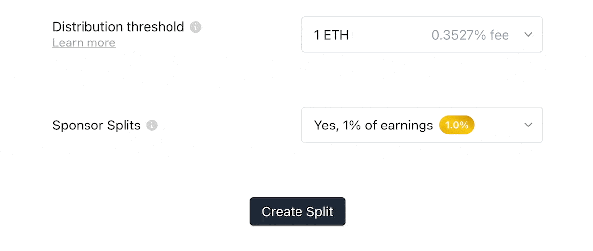 Adding a distribution bounty is the best way to automate your Splits. By adding a bounty, you're encouraging third-parties to come and distribute balances for the recipients. In an effort to more clearly communicate how this bounty works, we've redesigned this input to let you select the amount at which balances will be distributed. You can see (on the right side) what percentage the distributor fee will be based on the threshold you've selected.