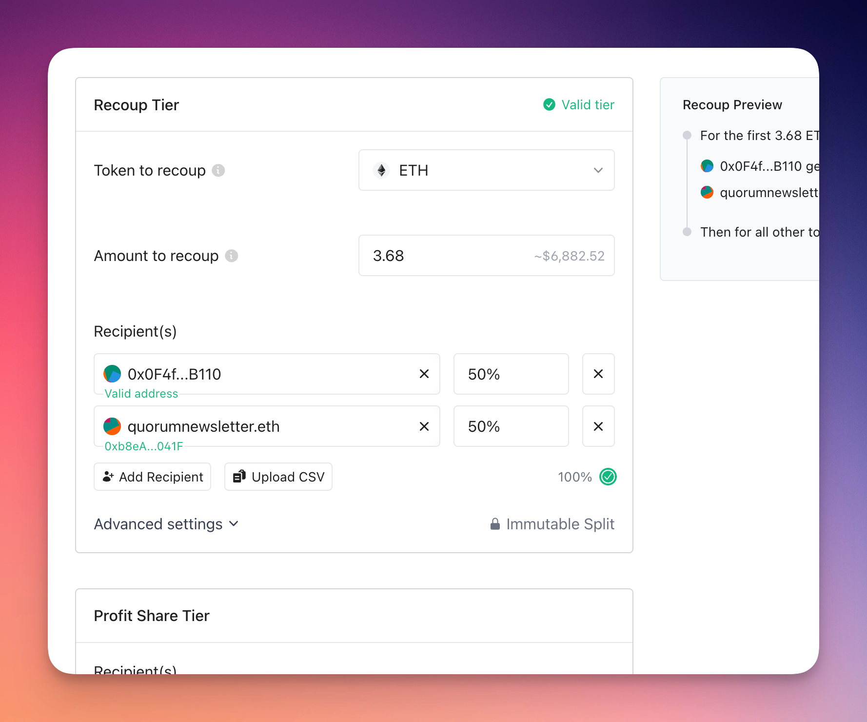 Finally, we took the changes we made to the new Split form, including the CSV upload flow, and added them to the new Recoup page as well. We have seen more and more folks use the Recoup flow, like this Metalabel drop, and have found that the process of creating a Recoup with many recipients was tedious. Plus, there were a number of bugs we learned about. So we fixed the bugs and brought all the Split improvements over to Recoup.