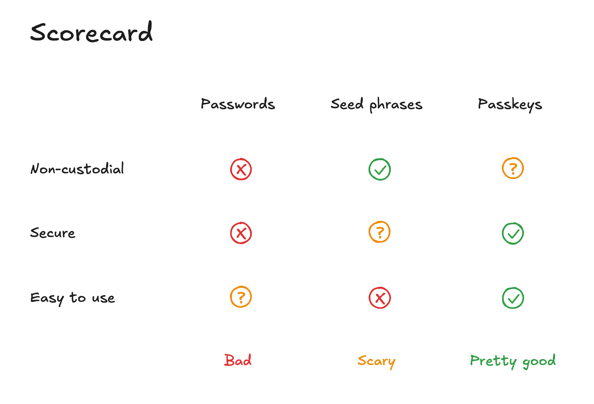 For a long time, all crypto users faced a big tradeoff between usability and security. You could choose between perpetual annoyance or constant nerves. Do passkeys thread that needle? For the most part, we believe they do. Passkeys are not a panacea for all potential security pitfalls, but a big step forward on the whole.