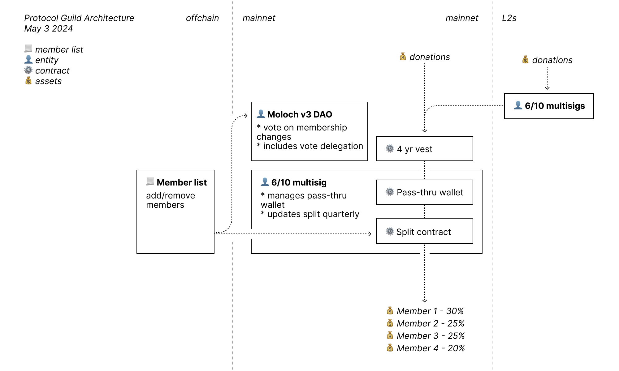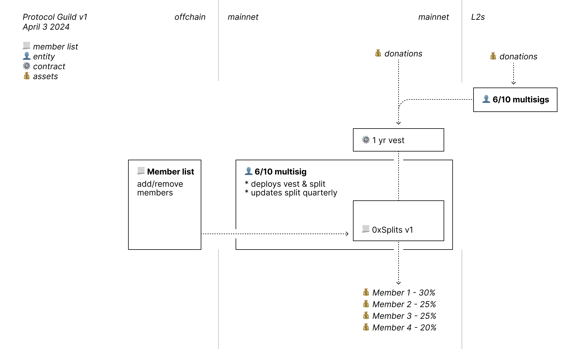 What we've done over the last year is develop an intermediary contract, called just a registry contract, that holds some of this information onchain. And in doing so we prevent [meddling, whether intentional or otherwise]. I can't tweak these on my own, it's hardcoded, and anybody can poke this registry contract which then feeds into the Split. So that's the main difference [from v1 of Protocol Guild].
