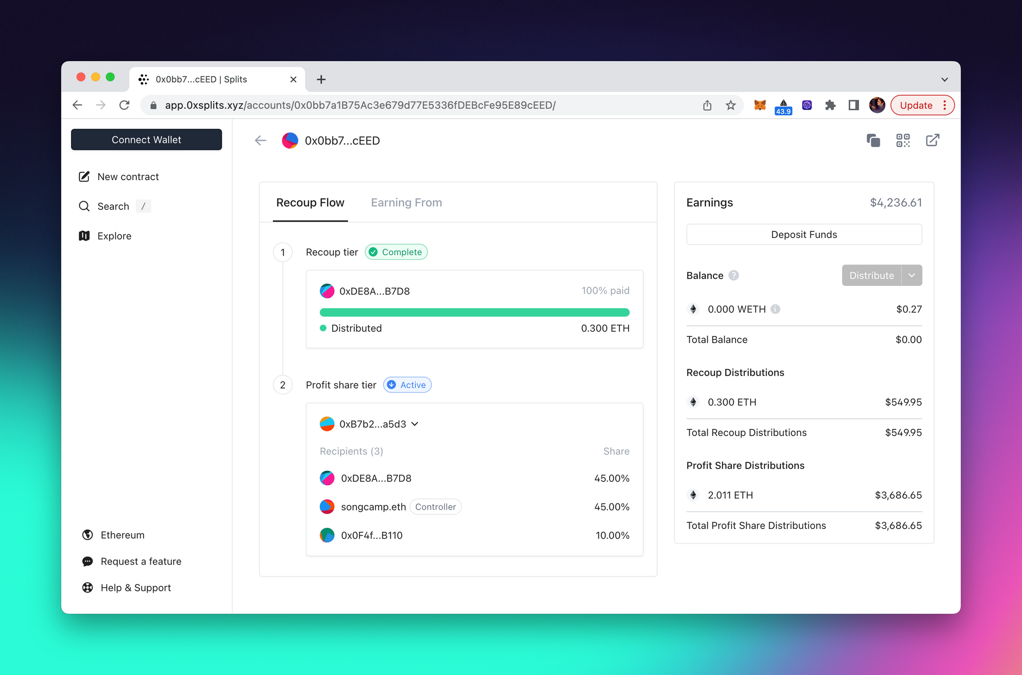 When Waterfall launched a few months ago, we thought about how great it would be to pair it with Splits. In fact, Metalabel did just this. This combination of Waterfall + Splits lets you create all sorts of interesting structures that revolve around splitting profits instead of revenue. Most projects have upfront costs, and the person who covers those costs wants to be repaid before profits are split among the group. Musicians, VC, PE, debt—tons of workflows exist that need to combine these contracts together.