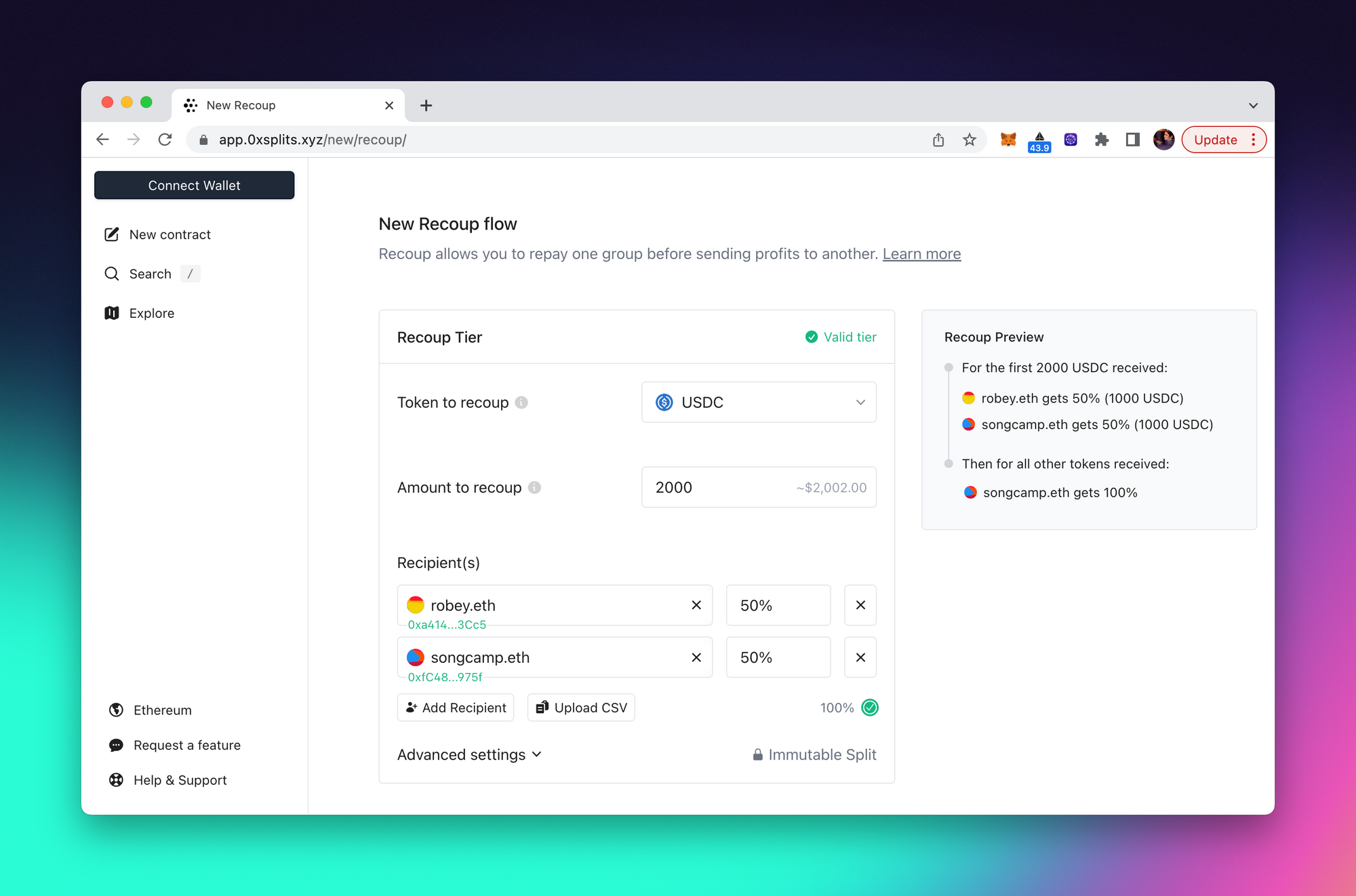 The problem is that to do so requires deep knowledge of how the system as a whole operates, since you can't create a Waterfall that points to a Split unless that Split already exists. Recoup solves this problem. It's a very simple contract paired with a UI that lets you, in a single transaction, create a Waterfall that points to multiple Splits.