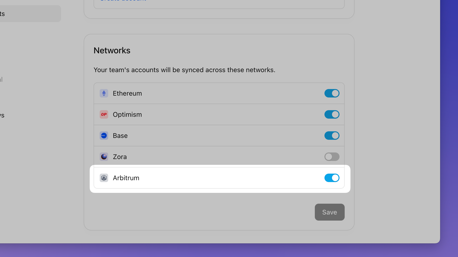 You can also now use Teams on Arbitrum. To enable Arbitrum (or change any networks on which your accounts are synced), go to your team's account settings page and toggle on/off specific networks.