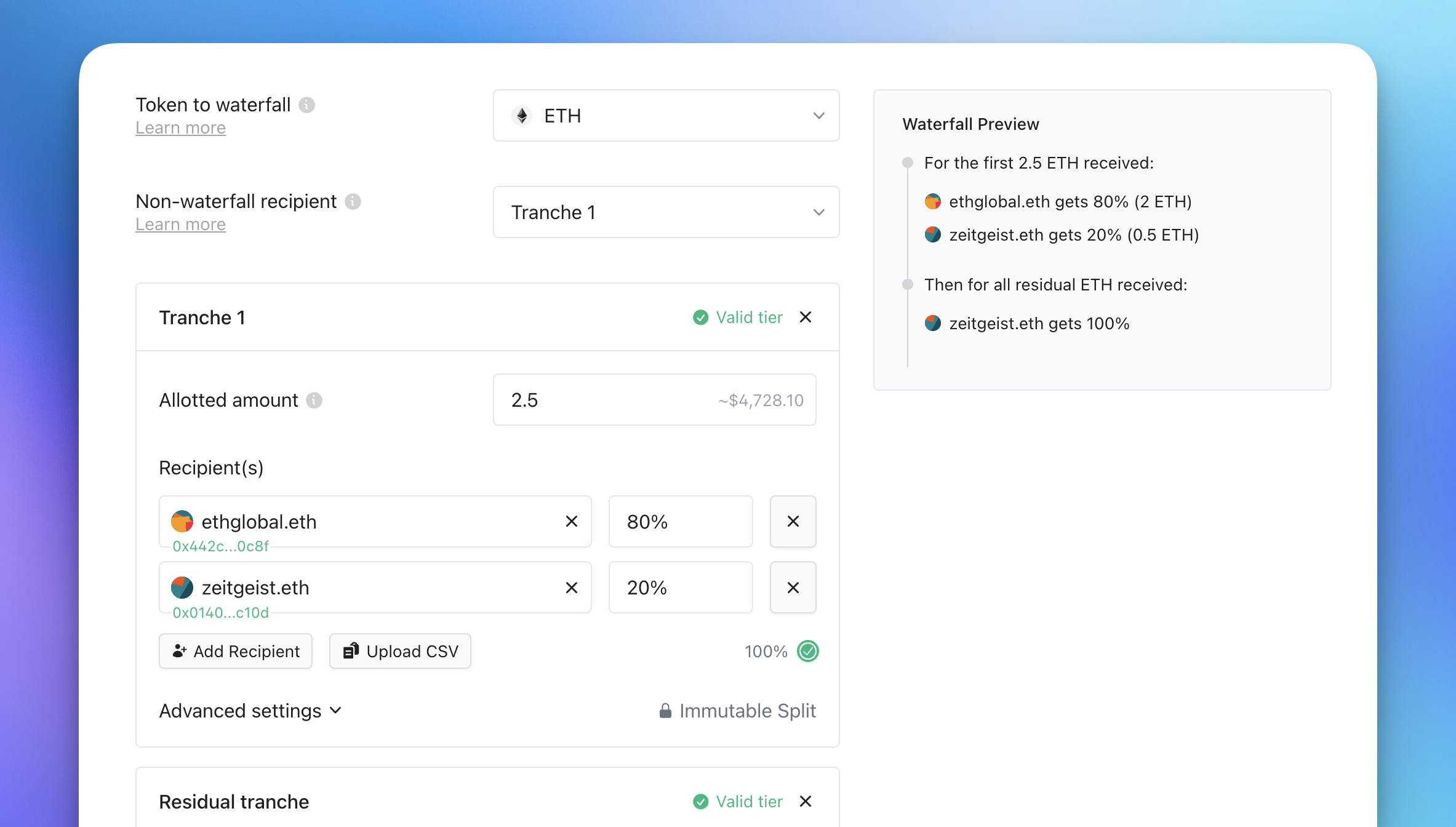 When creating a Waterfall, you can now specify multiple recipients for each tranche. More often than not, Waterfall users want to split payments among multiple people, and previously this required separate transactions.